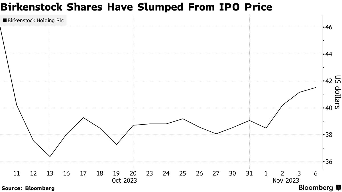 上个月,Birkenstock 在其交易首日表现不佳,下跌了12.6%,根据彭博社编制的数据,这是美国市值超过10亿美元的公司在两年多以来的最差首日表现。