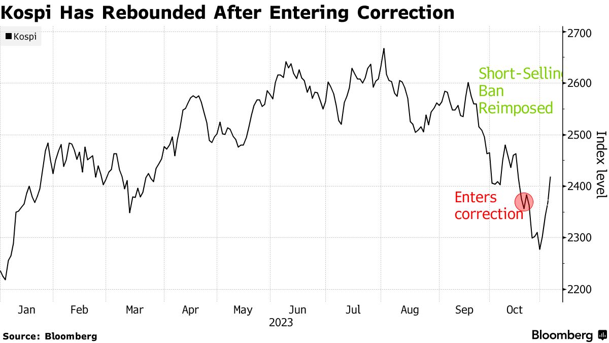 韩国股市在该国重新实施全面禁止卖空之后飙升,这是一项备受争议的举措,监管机构表示这是为了阻止对冲基金和其他全球投资者经常使用的交易策略的非法使用。