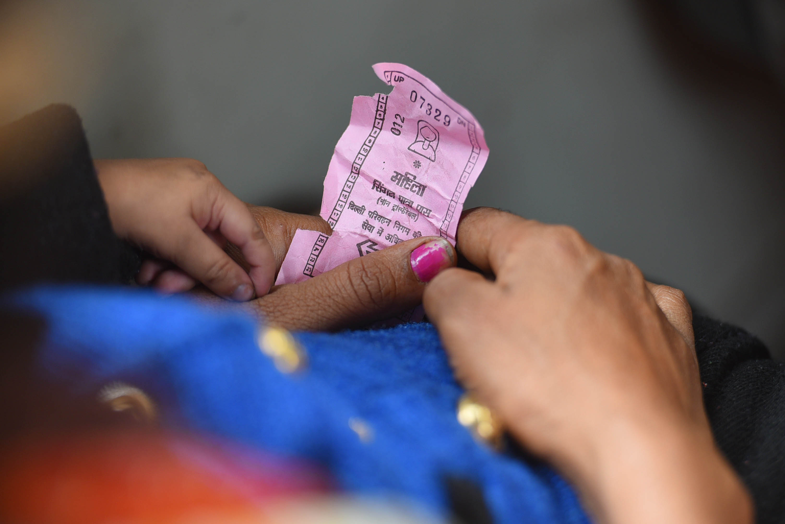 2019年,新德里公交车上的一张粉色免费乘车券。摄影师:Sanchit Khanna/Hindustan Times/Getty Images这些政策旨在通过使工作和出行更加便利和低成本来增加劳动力市场中的女性人数。在印度,男性仍然经常控制女性获取金钱的途径;尽管同样的男性可能反对家里的女性外出工作,但免费交通给了他们一个以前没有的选择。即使女性被允许工作,如果通勤不可靠或负担不起,她们通常会选择不工作。