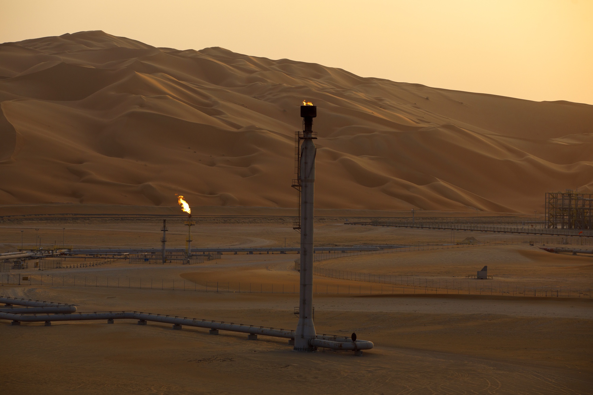火焰在沙特阿拉伯沙伯沙漠的沙特阿美石油田油气处理设施燃烧。