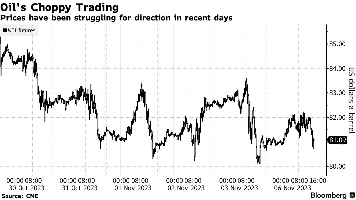 西德克萨斯中质原油周一在接近81美元/桶的水平上波动了近2美元,最终上涨不到1%。尽管原油在当天早些时候出现了较强的涨幅,但下午随着原油跟随股市走低而消失。然而,由于中东地区的产出未受到干扰,原油仍在以以色列-哈马斯战争开始前的价格交易,中东地区约占全球原油产量的三分之一。