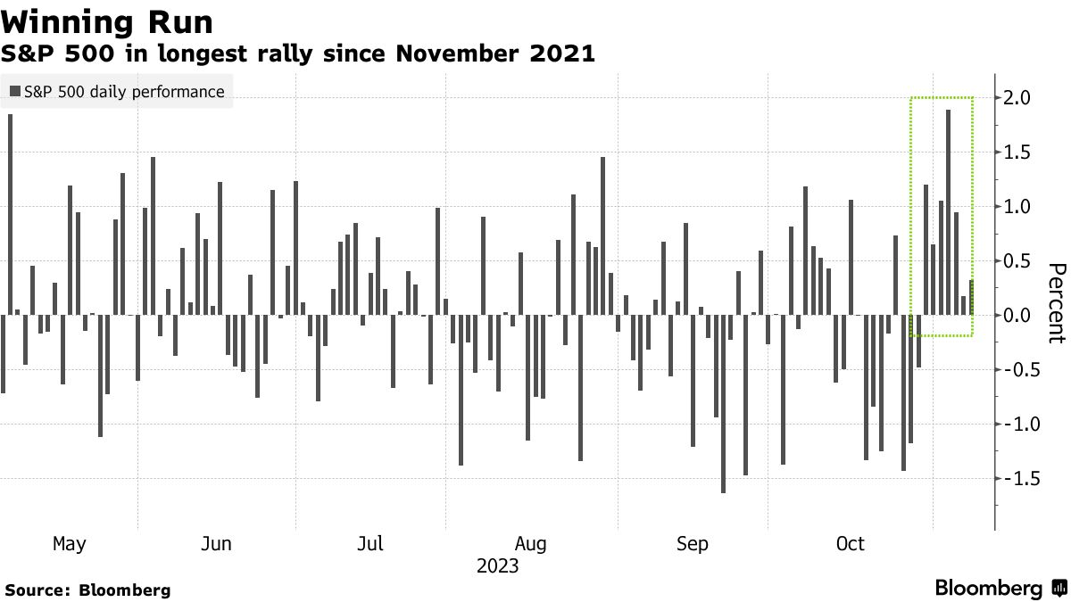 在交易的第一个小时经历了一系列曲折之后,S&P 500明显上涨,连续第七天上涨,接近关键的4,400点。 Nasdaq 100上涨近1%,微软公司创纪录上涨,云软件股票飙升。对明年美联储的转向押注使债券利率急剧下降,10年期收益率跌破4.6%。石油下跌超过4%,收于每桶约77美元。