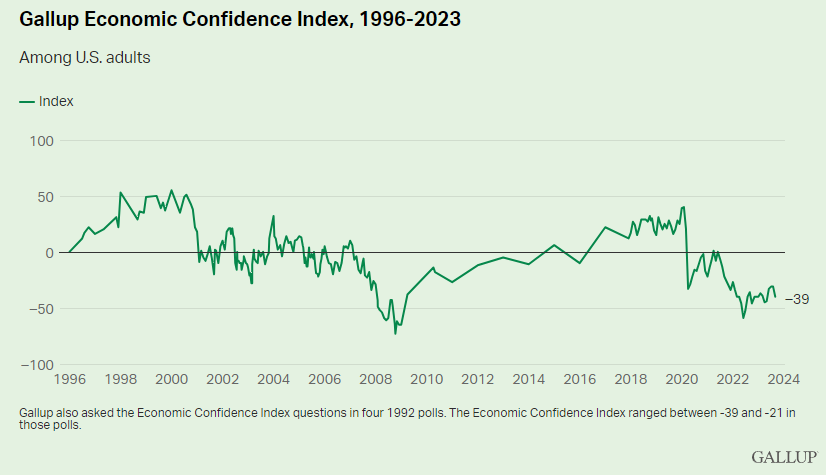 但对民主党人来说,这仍然是令人难以忍受的阅读,与其他调查结果一致,表明美国人深感不满。这是盖洛普经济信心定期调查,追溯至1996年 —— 对于拜登来说,现在的信心比疫情最严重时期还要低,这不能算是好消息: