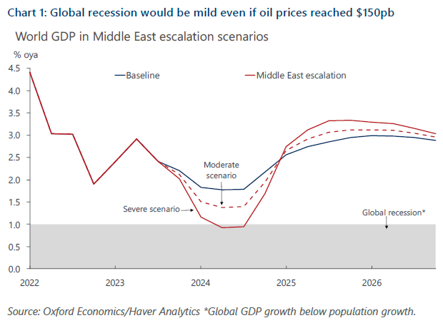 尽管如此,牛津经济学自己的计算表明,即使是最悲观的预测,涉及与伊朗的直接冲突以及足够干扰全球石油供应以将原油价格推高至每桶150美元以上,也只会将全球经济推入衰退: