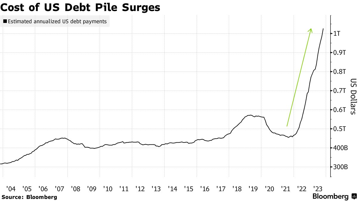 彭博分析显示,美国政府债务堆积的预计年化利息支付在上个月底已经超过了1万亿美元。这一预计金额在过去19个月中翻了一番,相当于此前预测的数字。
