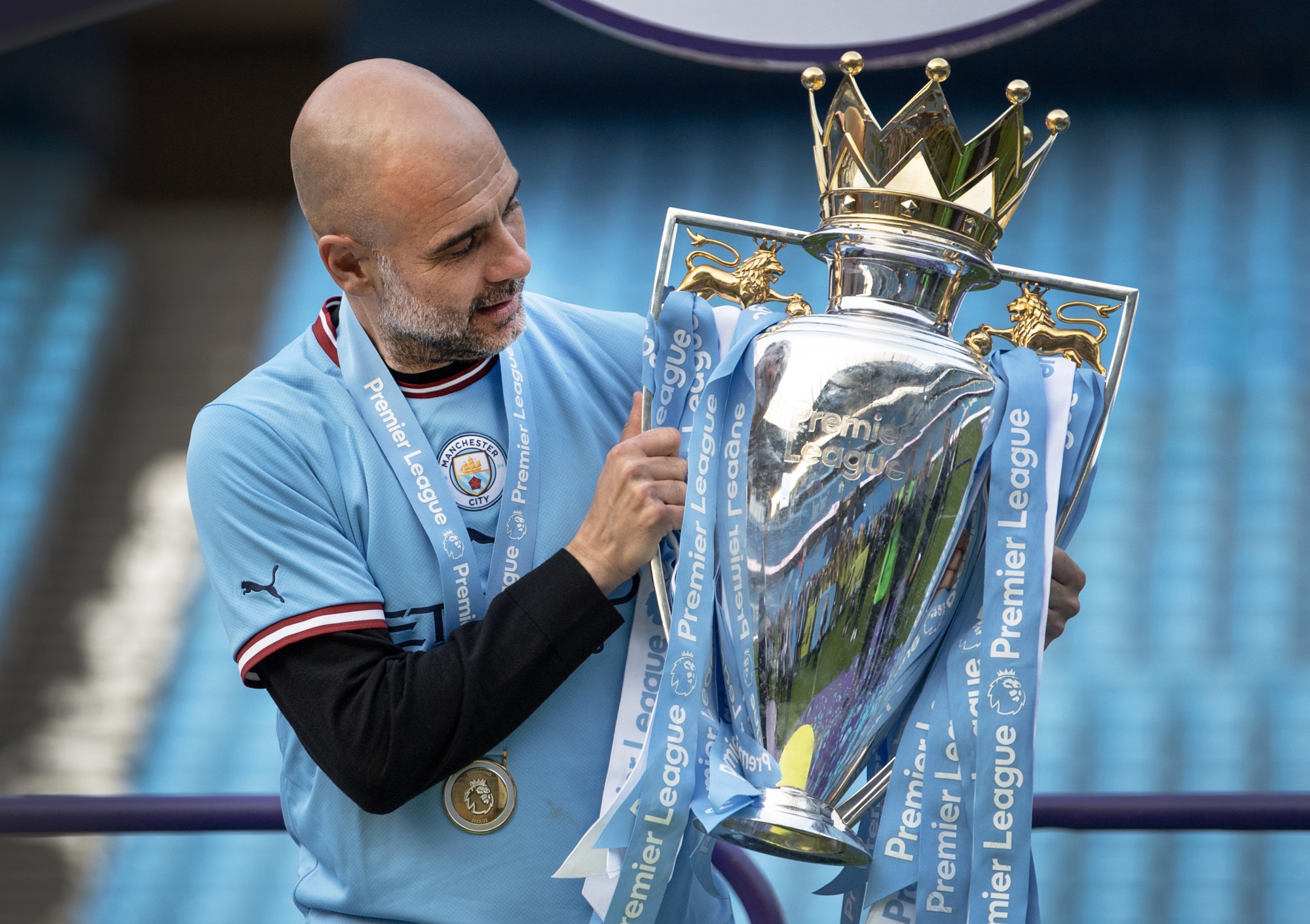 曼彻斯特城主教练瓜迪奥拉在赢得比赛后与英超联赛奖杯合影。