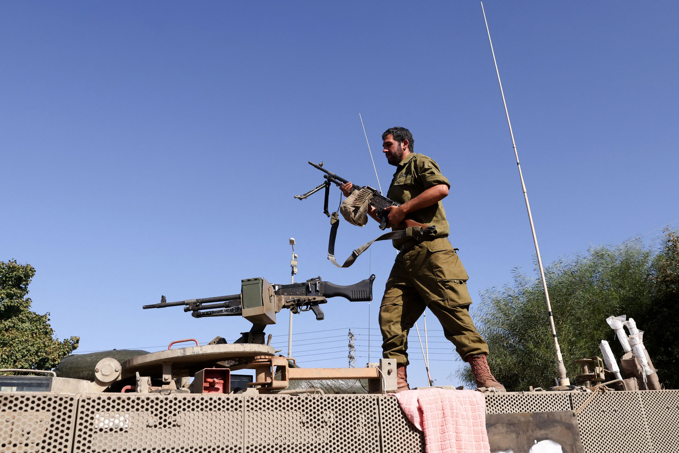 11月7日,一名以色列士兵站在黎巴嫩边境附近的装甲车上。摄影师:Jalaa Marey/AFP/Getty Images### 以色列军队表示正在逼近加沙市,重点是地道(下午2:15)