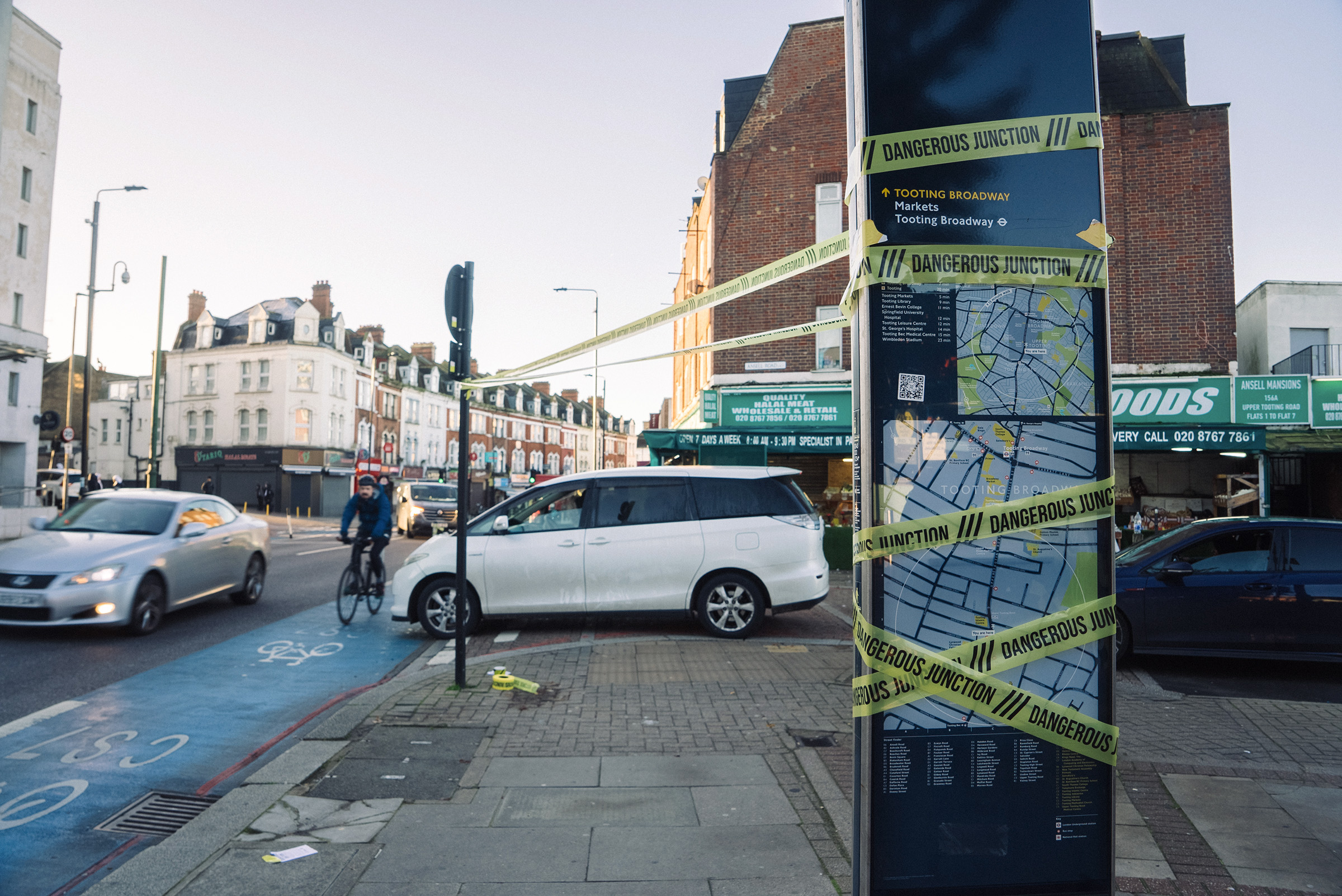 在伦敦图廷的自行车超级高速公路7号上,有一个危险的路口。