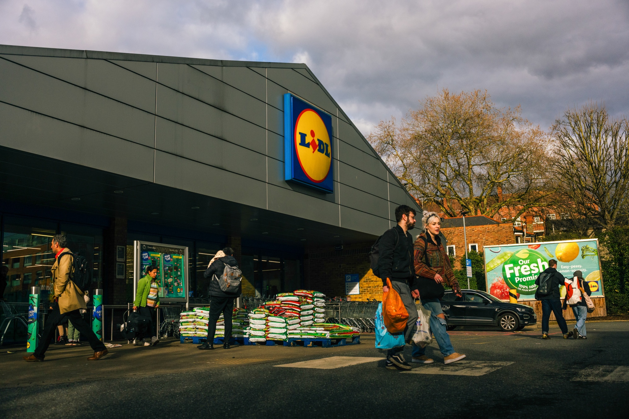 购物者离开英国伦敦哈克尼区的一家利德尔有限公司超市。