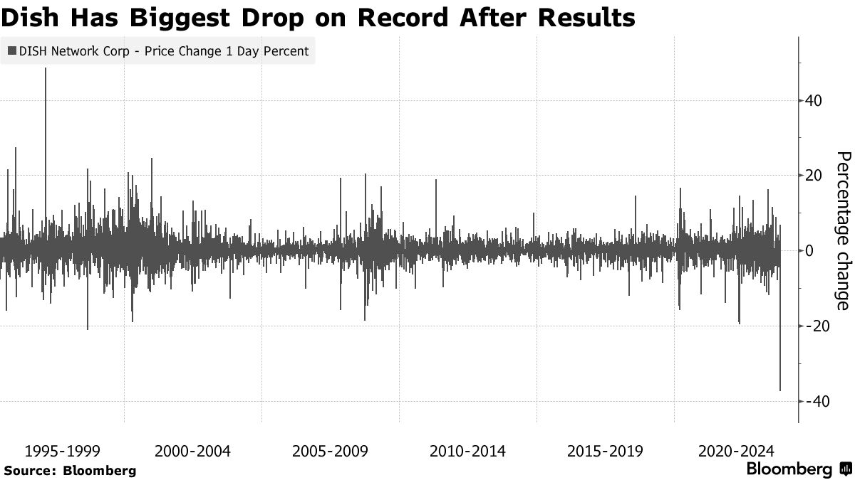 Dish Network股价周一暴跌37%,创下有史以来最大的单日百分比跌幅。这次抛售使股价跌至1998年11月以来的最低收盘价,此前结果被一位分析师描述为“惊人的糟糕”。今年股价下跌超过75%。