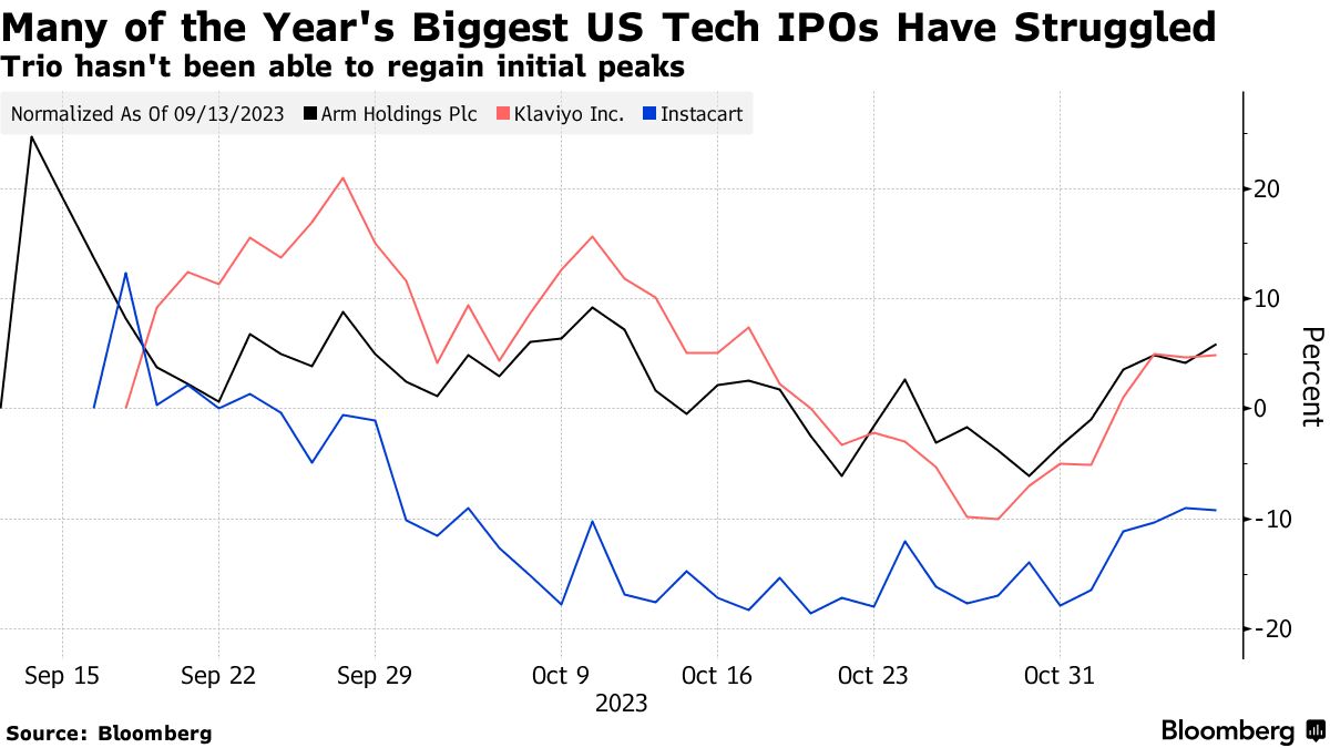 尽管预计该集团将标志着停滞不前的IPO市场的转折点 — 他们今年通过美国交易所进行的IPO筹集的资金超过四分之一 — 但它们从强劲的开盘日开始就逐渐消退。芯片设计公司Arm和向其他企业销售软件的Klaviyo的估值受到投资者的审视,而Instacart以大幅折扣上市,低于其上一轮私募融资。