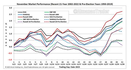 尽管11月被认为是股市表现最好的月份之一,但也存在弱势时期。根据《股票交易员年鉴》的编辑Jeffrey Hirsch的说法,在一个强劲开盘之后,市场往往会在月中和美国感恩节假期前横盘走势,然后在月底反弹。