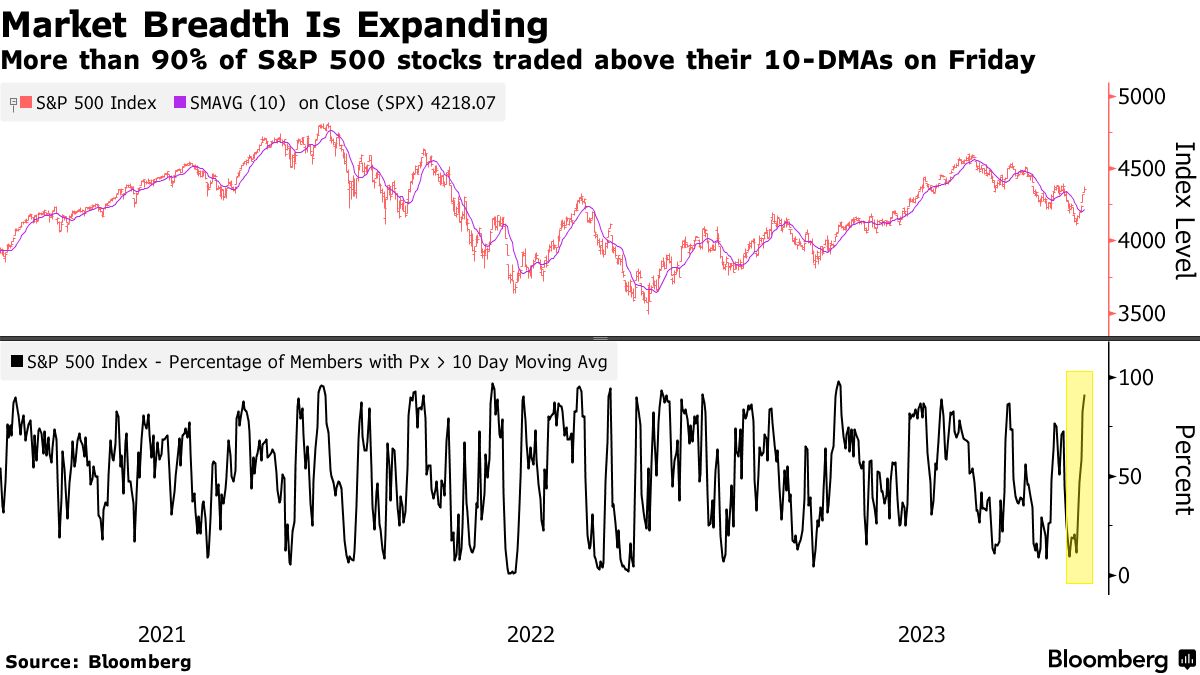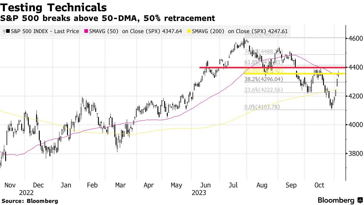 上周五,标普500指数扭转了自9月高点以来的下跌趋势,在上周五飙升近6%后达到了4350点。它还收复了50日移动平均线,之前已经穿过了200日移动平均线。穿过移动平均线是关键的,因为它可以信号情绪的转变。股票在周一保持住了这些涨幅。