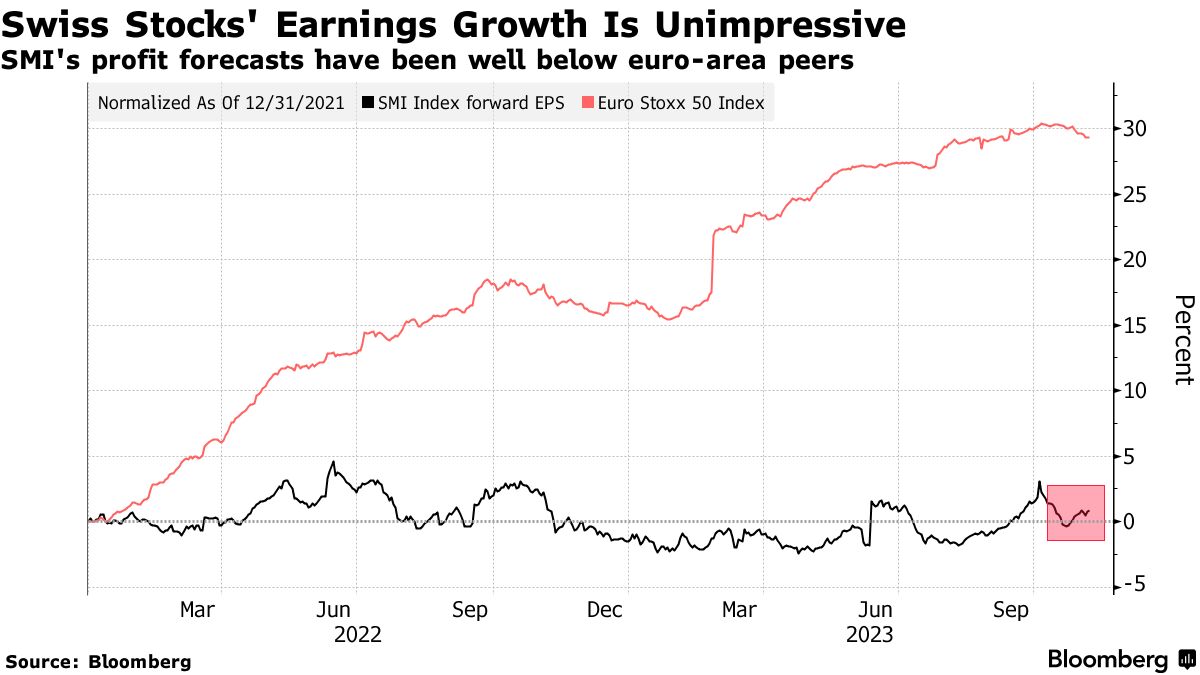 除了业绩不佳的季节外,SMI成员的利润预期明显落后于欧元区竞争对手。自2021年初以来,欧洲斯托克斯50指数公司的前瞻每股收益已经上涨了近30%,而SMI几乎没有增长。