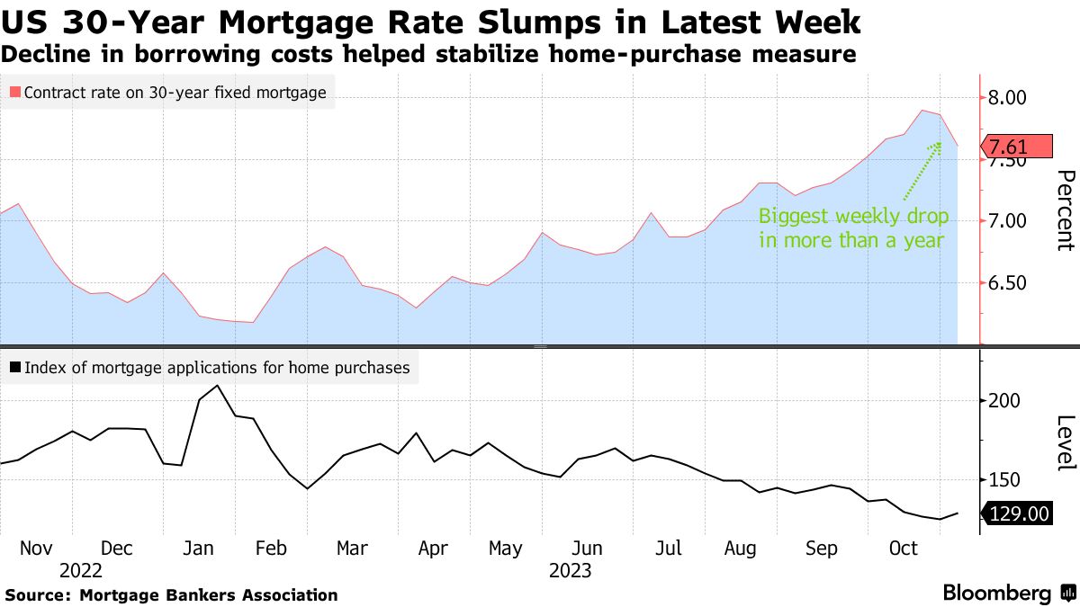 根据抵押银行家协会的数据,30年期固定抵押贷款的合同利率下降了25个基点,降至7.61%,为9月底以来的最低水平。周三公布的数据显示,该协会的房屋购买抵押贷款申请指数在截至11月3日的一周内增长了3%。