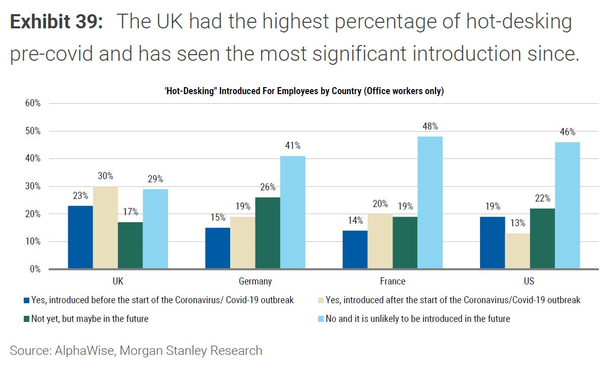来源:摩根士丹利热插拔式办公桌——即不分配给特定员工的灵活工作区域——似乎在英国最为普遍,根据该银行进行的一项调查。在英国受访者中,有30%表示自新冠疫情爆发以来引入了这种方式,而在德国和法国分别约为20%,在美国仅为13%,他们写道。