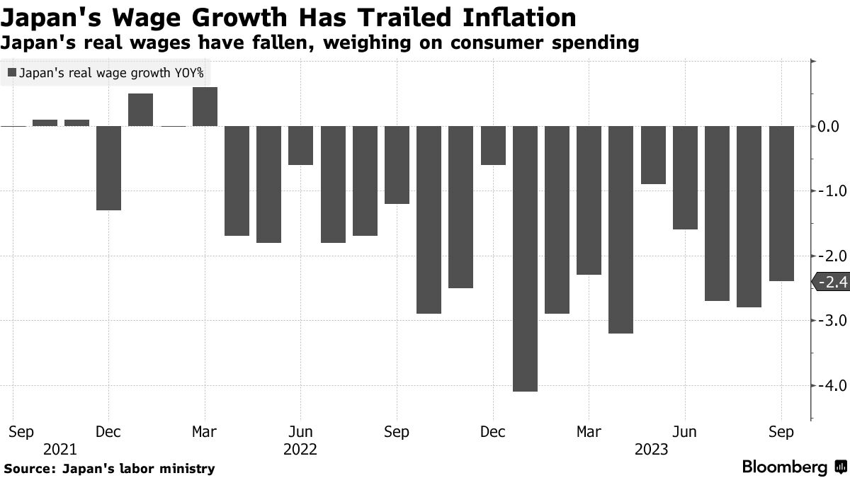 日本的实际工资已经连续下降了18个月,这引发了对经济前景的担忧,因为消费支出无法推动产出。日本首相岸田文雄上周编制了一个超出预期的经济方案,以缓解家庭生活成本上涨带来的痛苦,因为他的声望在他两年任期中保持在最低水平。