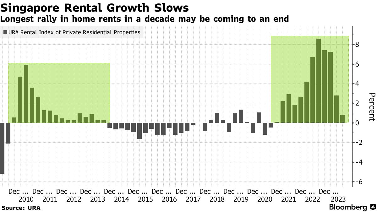 在本周三的一份报告中,彭博智库分析师Ken Foong表示,新加坡的住宅租金可能在2024年下降多达10%,而今年上涨了高达15%。他表示,如果宏观经济恶化或出现危机,下降幅度可能会更大。