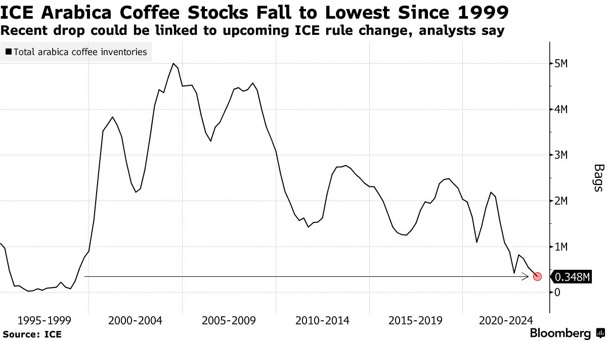 咖啡库存急剧下降,交易商在法律漏洞关闭前转移老化豆子-彭博社