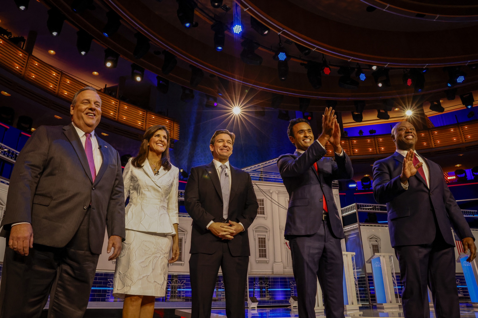 2024年的每位有希望的候选人——佛罗里达州州长朗·德桑蒂斯,前联合国大使尼基·哈利,企业家维韦克·拉马斯瓦米,南卡罗来纳州参议员蒂姆·斯科特和前新泽西州州长克里斯·克里斯蒂——比以往更愿意挑战前总统唐纳德·特朗普。主持人们将他们的第一个问题集中在缺席的共和党领跑者身上,他在11英里外举行了自己的集会。