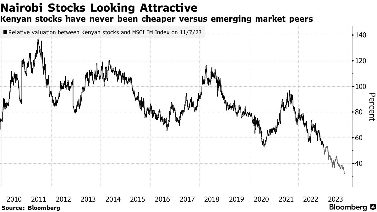 内罗毕整体指数在2023年下跌了32%,是彭博跟踪的92个全球基准中跌幅最大的。这使得股票比起更广泛的新兴市场来说变得更便宜。然而,很少有人愿意接手。