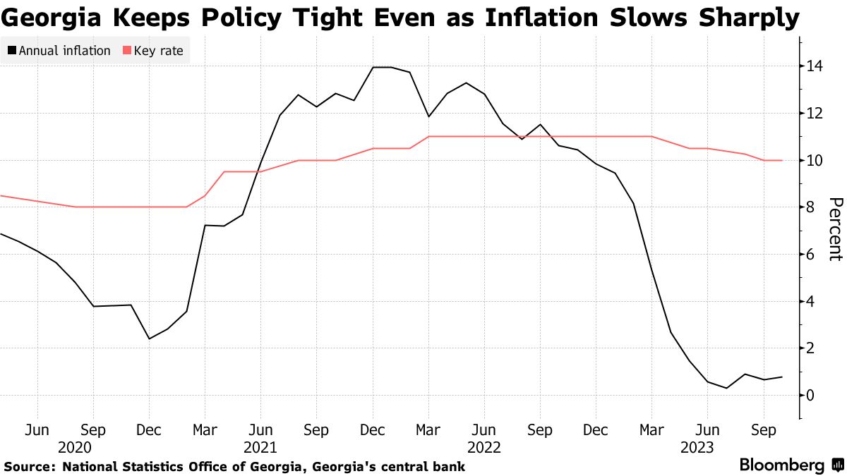 在应对这些挑战的同时,Turnava还在引导格鲁吉亚自新冠疫情以来的首次 货币宽松。由于通货膨胀急剧放缓,关键利率已经从11%的多年高点下调至10%。