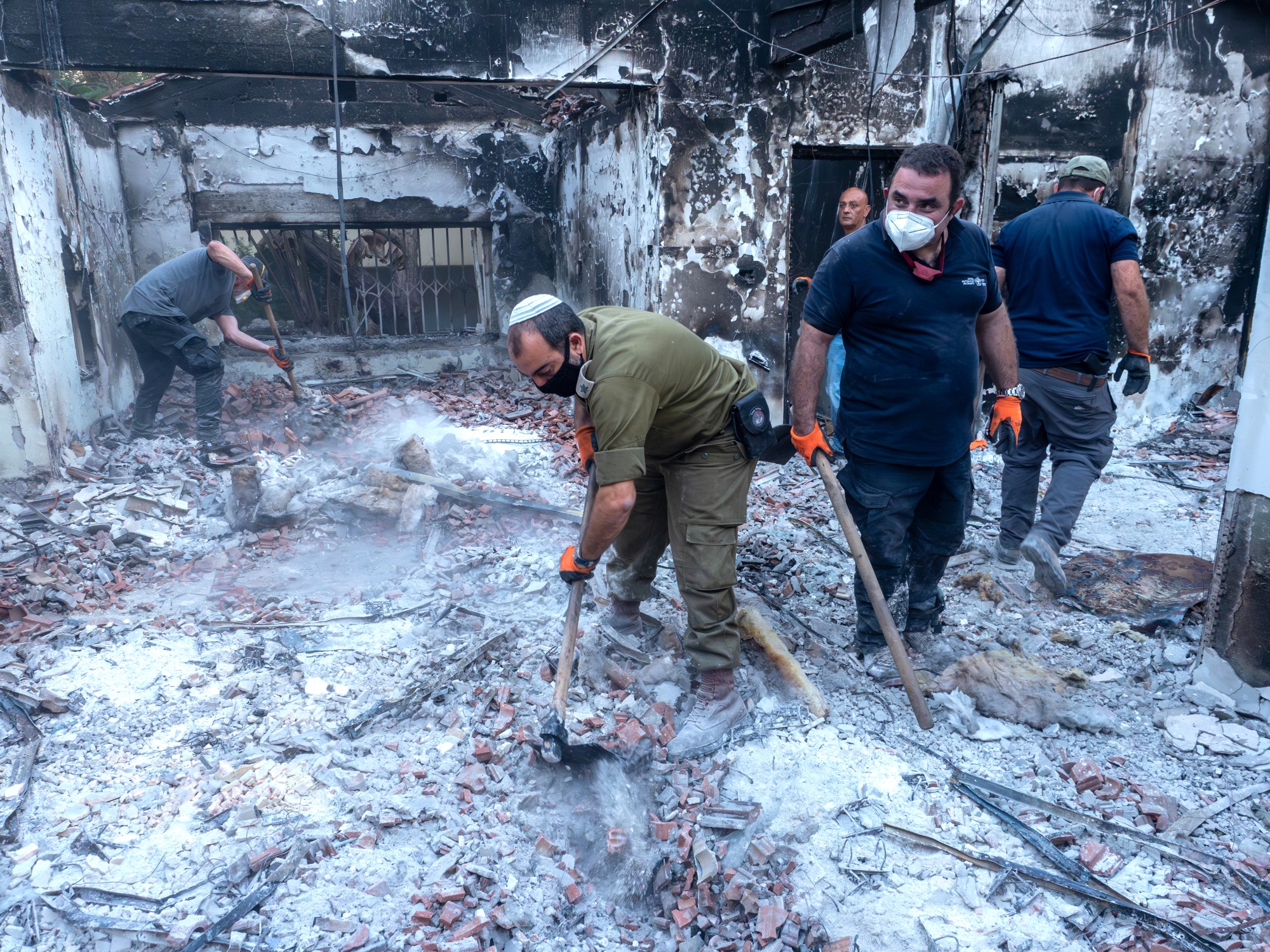 考古学家在基布兹·贝埃里的一处房屋废墟中搜寻。摄影师:以色列古物管理局的阿萨夫·佩雷兹“你到达现场,收集信息,”他说。“这里住着谁?谁失踪了?” 他的团队收集了细节:人们是否接受过手术,是否有可以识别他们的医疗板或螺丝钉。