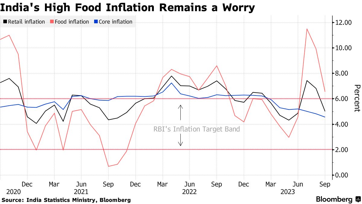 然而,占通胀篮子约一半的食品价格仍然存在风险,威胁整体局势。印度央行今年多次上调利率以遏制通胀,但已连续四次未改变利率。