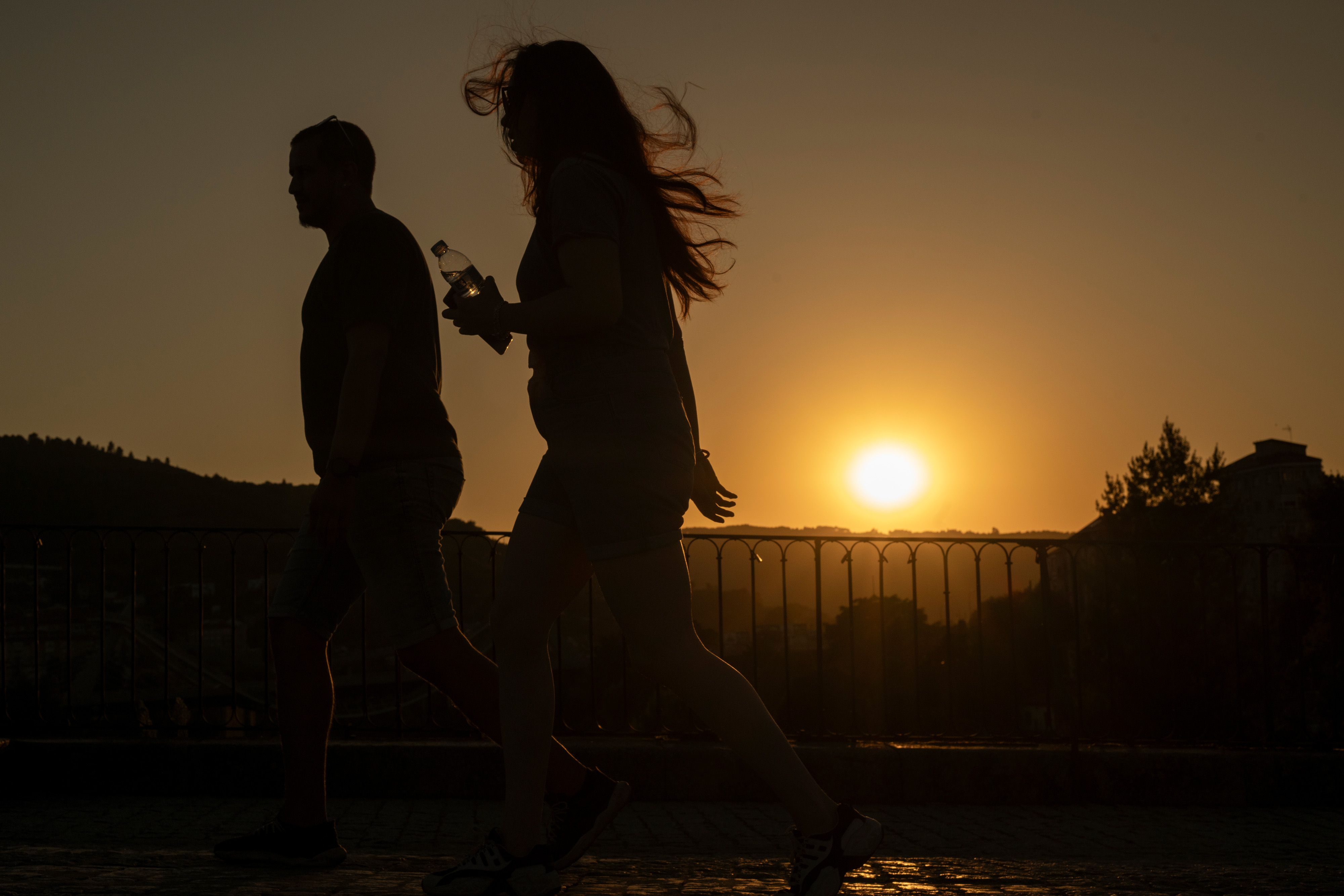 居民们在西班牙奥伦塞(Ourense)的一座人行天桥上散步,太阳在8月8日落山时。
