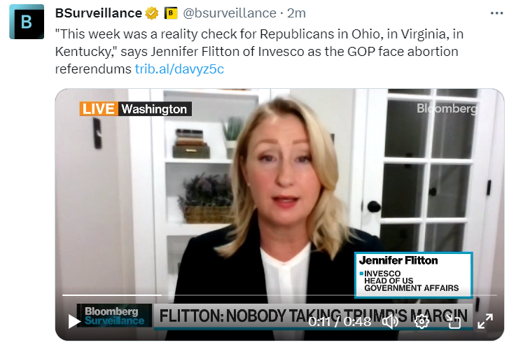 “本周对共和党人来说是一次现实检验,”英威投资公司的詹·弗利顿说,提到俄亥俄州公投中支持堕胎权利者的重大胜利,以及其他可能对2024年产生影响的竞选。