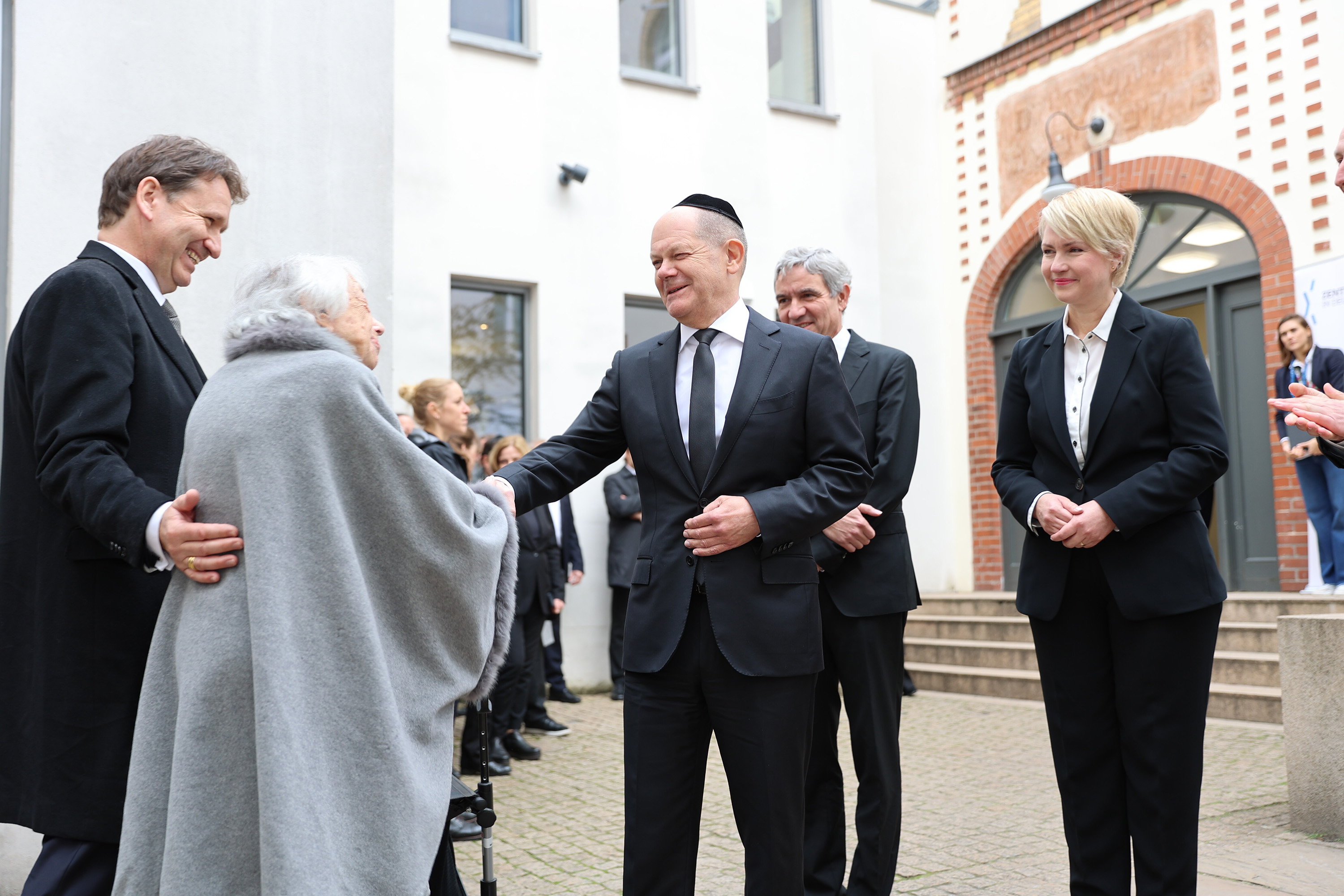 奥拉夫·肖尔茨在柏林的贝特锡安犹太教堂参加纪念1938年“水晶之夜”85周年纪念仪式,日期为11月9日