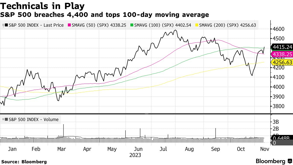 标普500指数最具影响力的股票群体的反弹推动该指数达到七周高点。美国股市基准股指突破了关键的4,400点关口和100日移动平均线 — 许多图表分析师认为这是一个利好迹象。纳斯达克100指数自五月以来涨幅最大,微软公司创下历史新高,英伟达公司连续第八个交易日上涨。