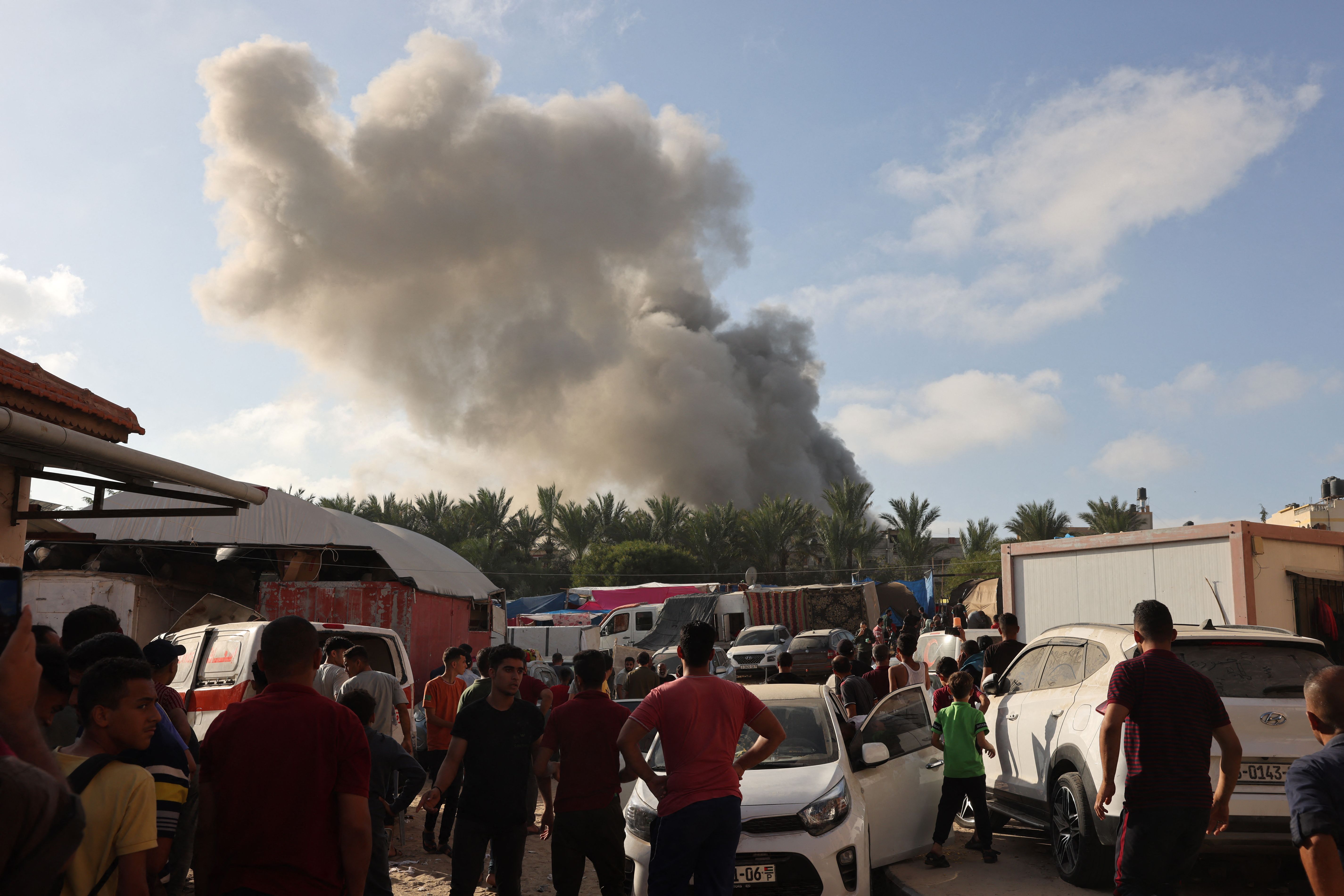 巴勒斯坦人看着以色列在11月8日对加沙汗尤尼斯的空袭后升起的烟雾。
