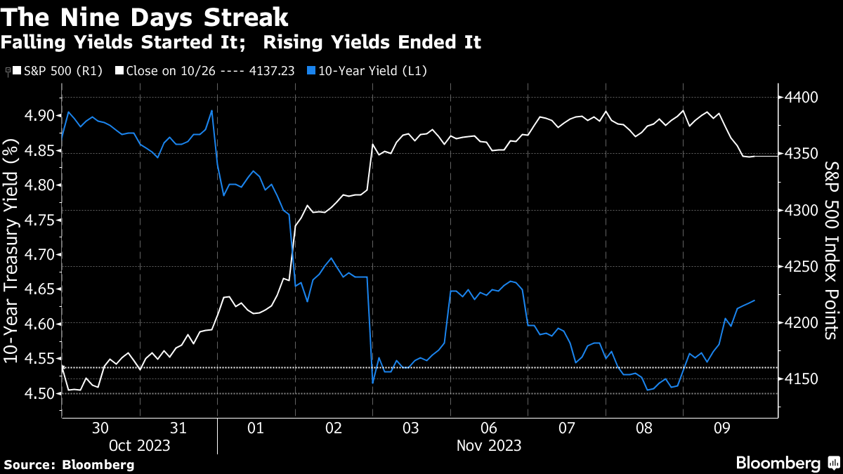 有趣的是,鲍威尔似乎还实现了对标普500指数的“语气纠正”,当天该指数下跌。美国股指已经连涨八天。第九天将使其成为近20年来最长的涨势。但在整个连涨期间,债券市场似乎掌握着主动权。随着收益率上涨得过快和过高,股市反弹所需并不多,而且上周两个市场似乎紧密相连。这一连胜在债券收益率再次急剧上升时结束,这并非巧合: