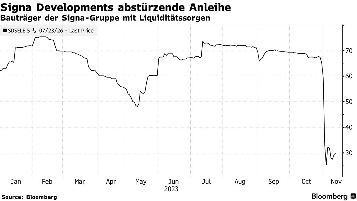 Signa Development的5.5%债券,未偿还金额为2.8亿欧元,在最近的动荡中大幅下跌,仅以每欧元约30分的价格交易。