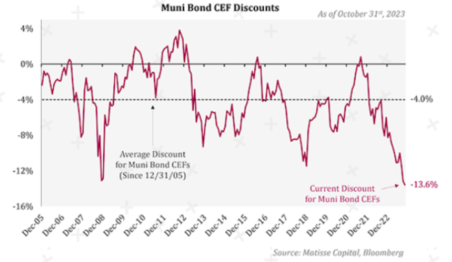 他们的大规模撤离正在转化为低价,吸引了对冲基金。封闭式基金是公开上市的,它们的股票可以以低于其持有资产价值的价格交易。目前这些折扣很大:例如,市政债券封闭式基金在10月底的平均交易价比其资产低出13.6%,这是至少15年来最高的,远高于历史平均值4%,根据Matisse Capital的数据。