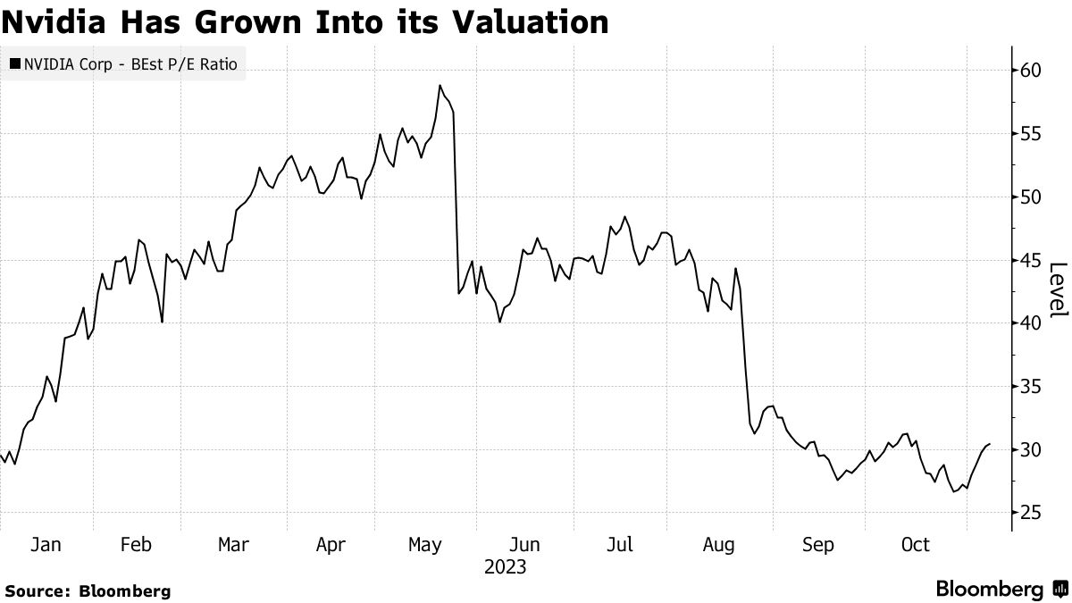 这是像Mapsignals的首席投资策略师Alec Young这样的投资者的观点,他们看到Nvidia股票自夏季以来在100美元的范围内交易,自8月份接近500美元后徘徊不前。但随着利润预期仍在上升,Nvidia的股价相对于预期收益的比率已降至自2022年中以来的最低水平。