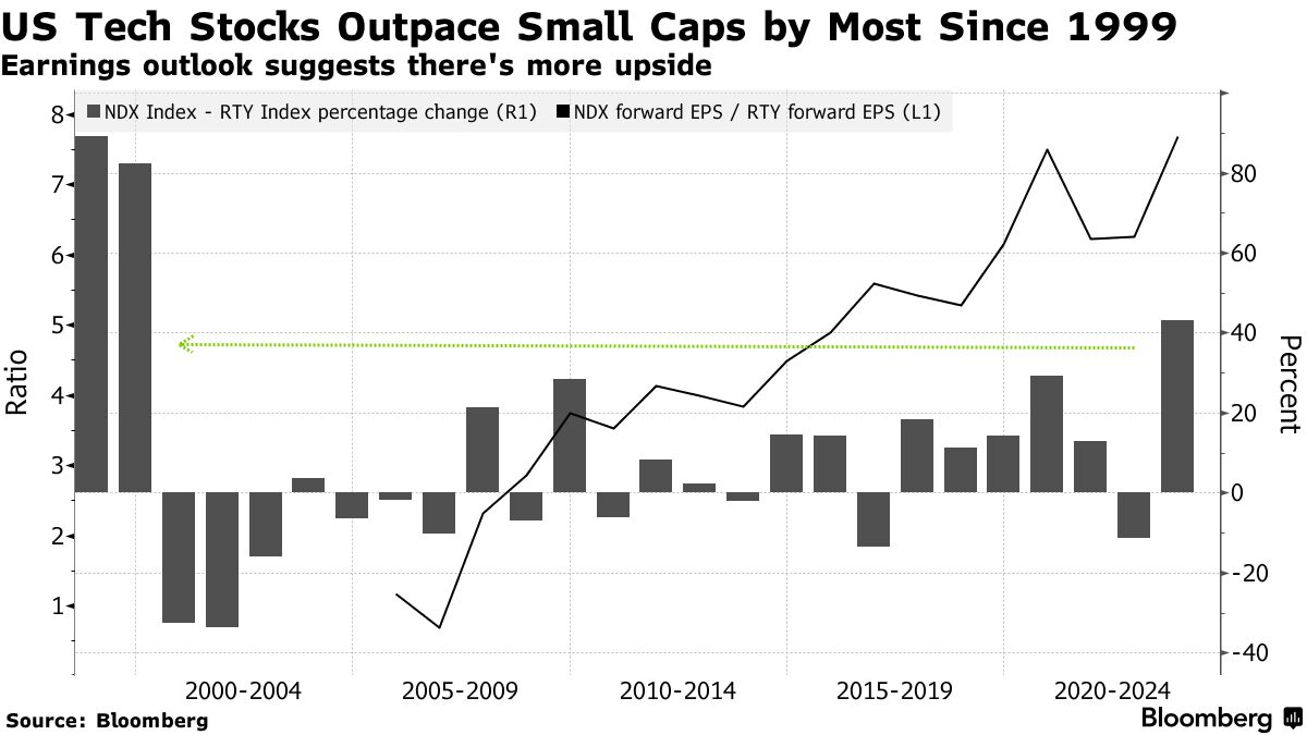 大型科技公司的利润前景是其将胜过小市值股票的另一个原因。根据彭博社编制的数据显示,该集团与消费者自由裁量权一起,是迄今为止本季度最大的赢家之一。而分析师对科技重点纳斯达克100指数相对于小市值罗素2000指数的12个月利润预测创下历史新高。