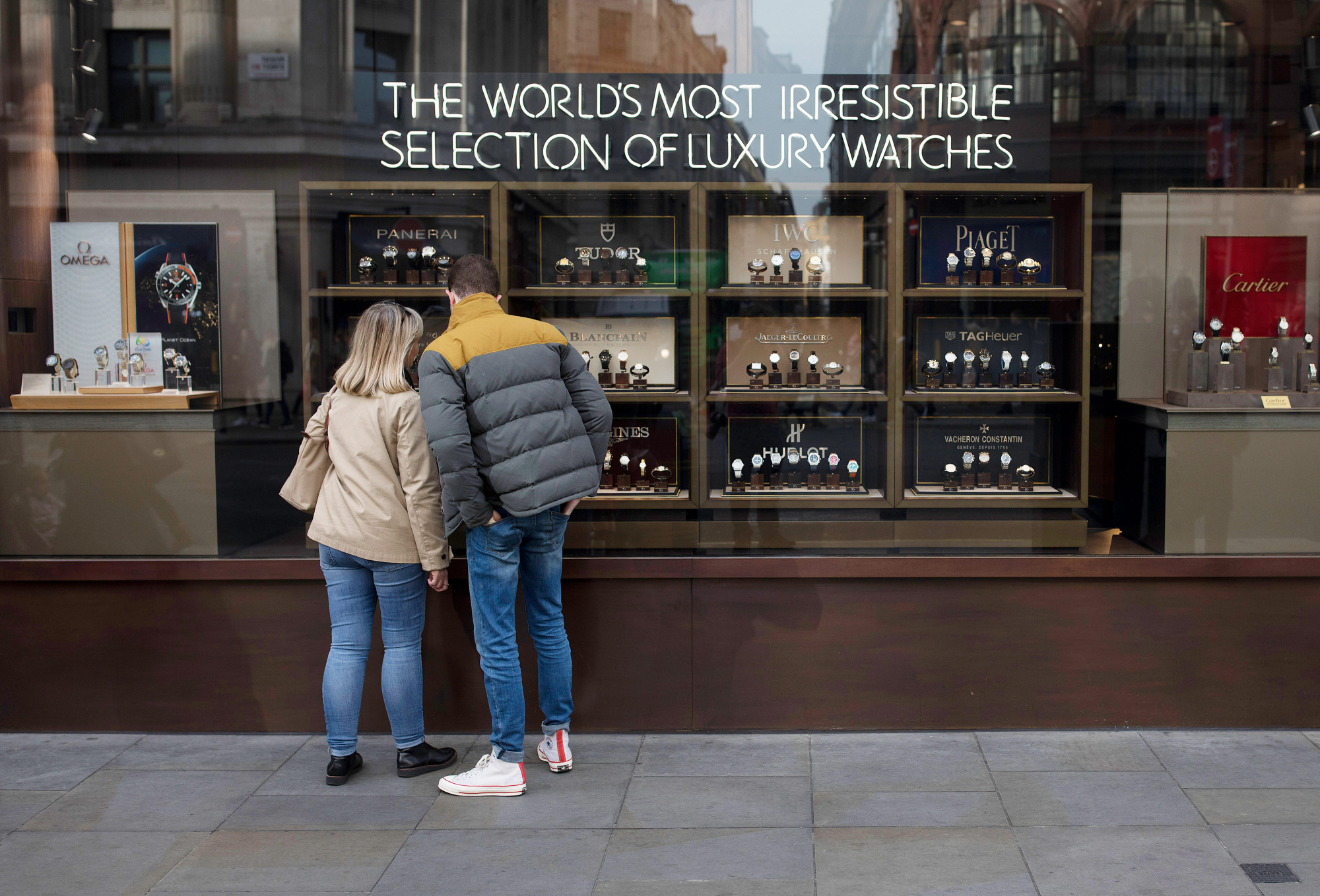 行人们在伦敦一家瑞士手表零售店的橱窗前观看豪华手表展示。