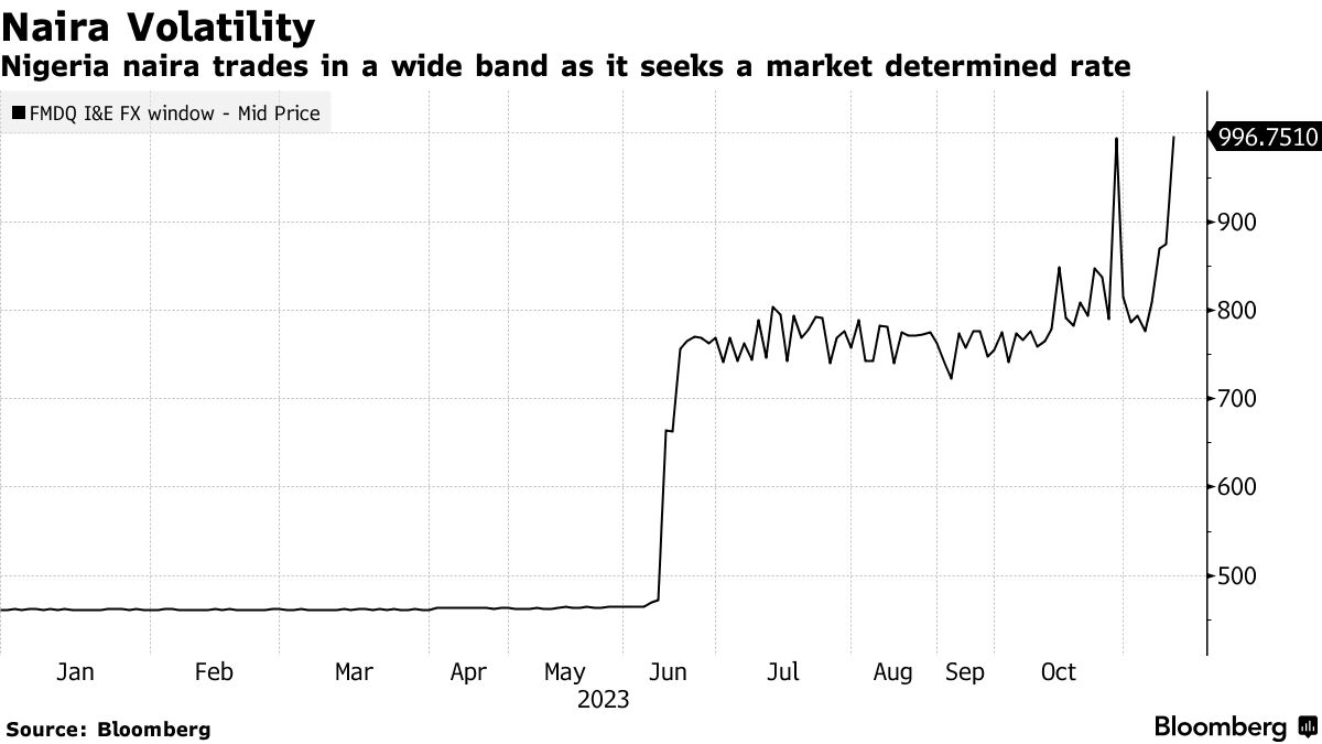 根据彭博编制的数据,本地货币单位在官方市场下跌了14%,收盘价为996.75奈拉兑一美元,这是有记录以来最低的交易水平。这是自10月30日以来最陡的单日跌幅,当时汇率下跌了25%,至993.82奈拉兑一美元,随后第二天反弹了18%。