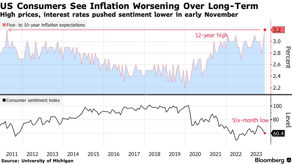 美国消费者对长期通货膨胀预期升至自2011年以来的最高水平,同时对高借贷成本和经济前景的担忧在11月初加剧,给情绪带来了新的打击。