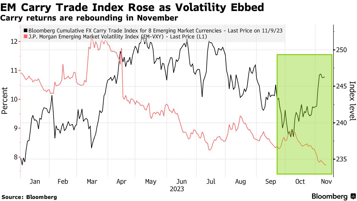 过去三个月,由于债务收益率攀升,发展中国家资产承受了压力,这削弱了风险偏好。但在美联储政策委员会在11月将利率维持在5.25%至5.5%的范围后,债券市场的抛售显示出稳定的迹象,这是22年来的最高水平。