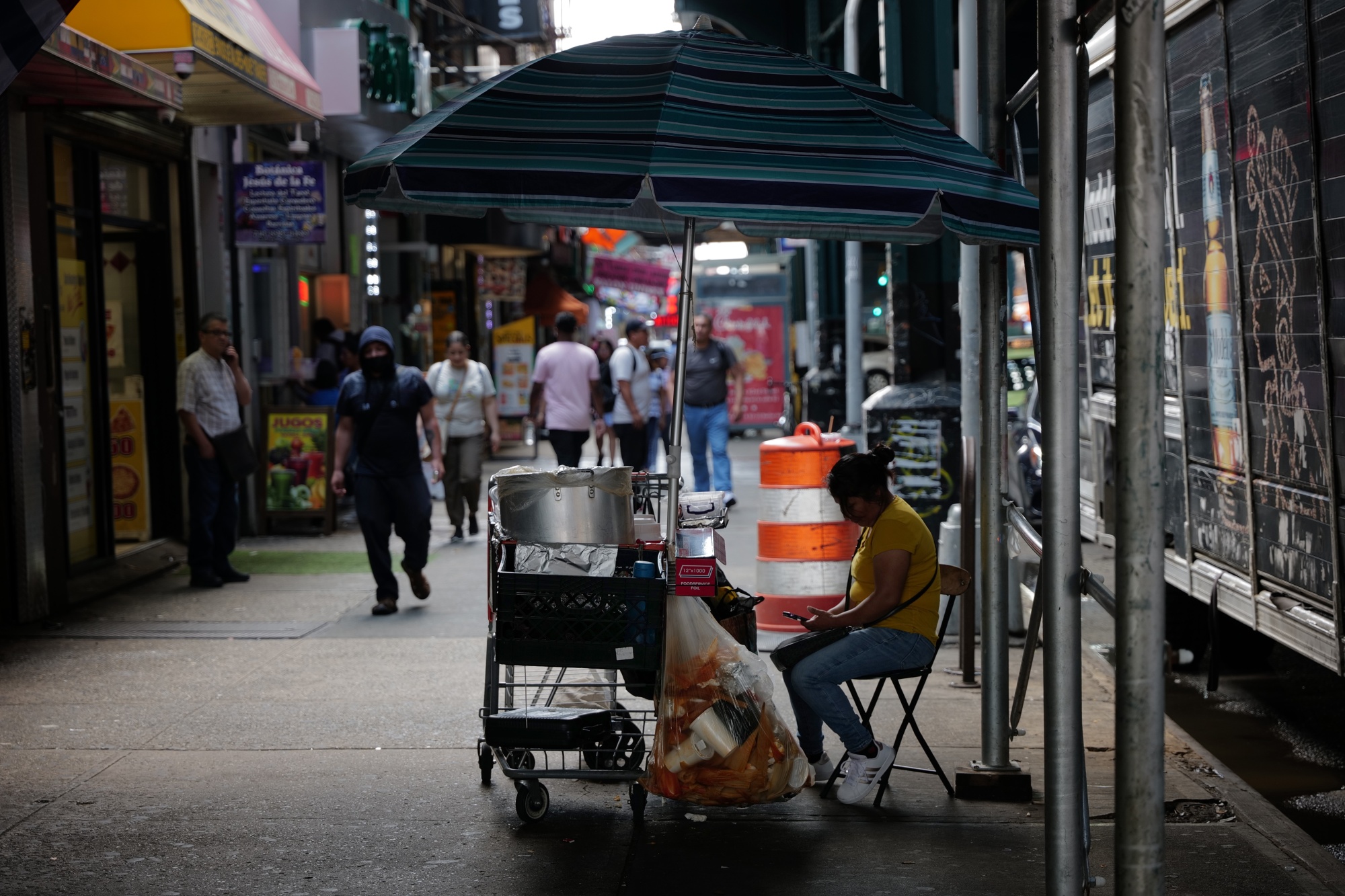 在纽约市皇后区的罗斯福大道上,一位街头摊贩销售产品,这是一个拥有大量近期移民的地区。在最近几个月,来自拉丁美洲和非洲的移民激增,城市中没有许可证经营的街头摊贩数量显著增加。摄影师:Spencer Platt/Getty Images### 明天你需要知道的事情