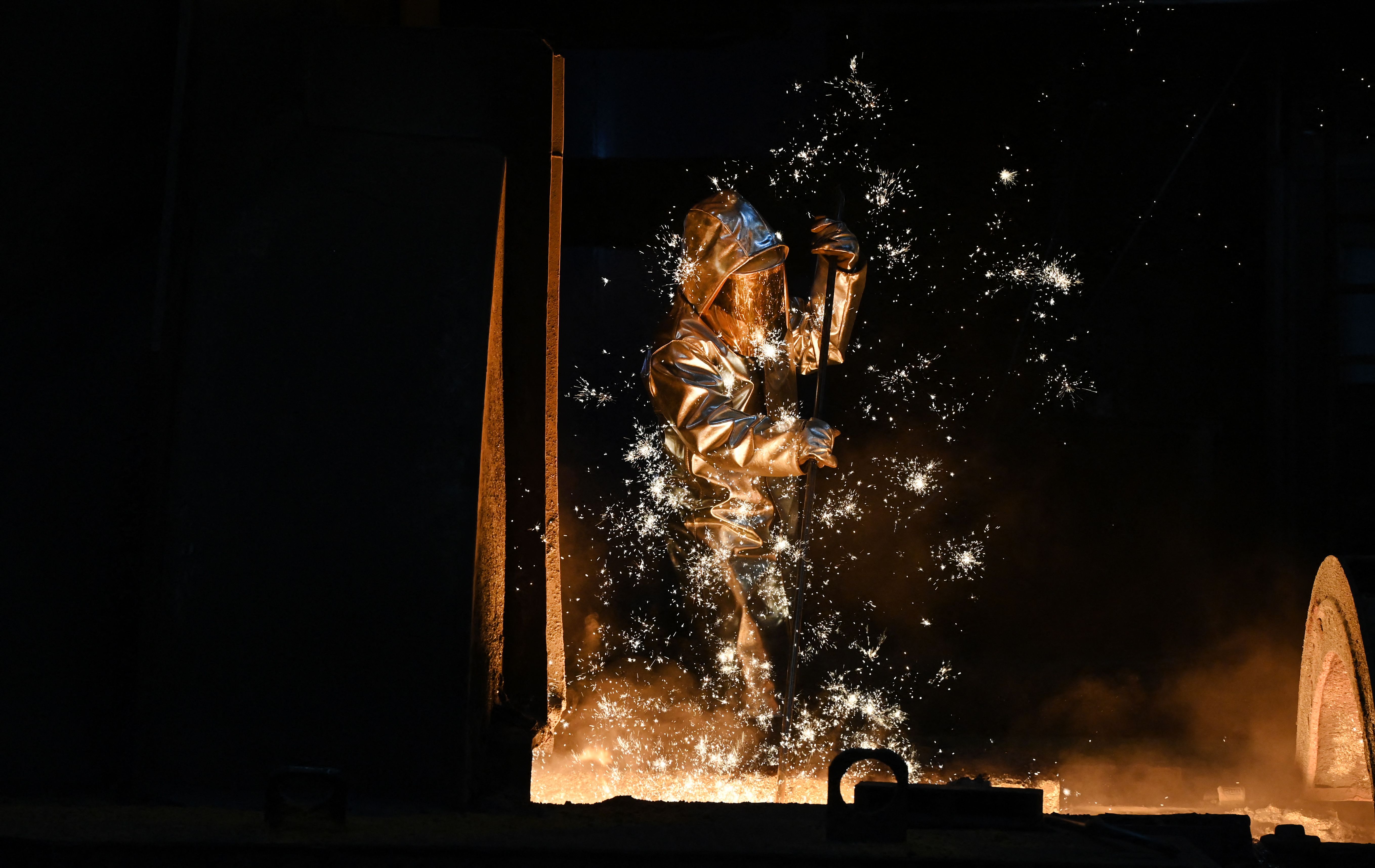 一名员工在德国杜伊斯堡的蒂森克虏伯工厂的高炉处取样。