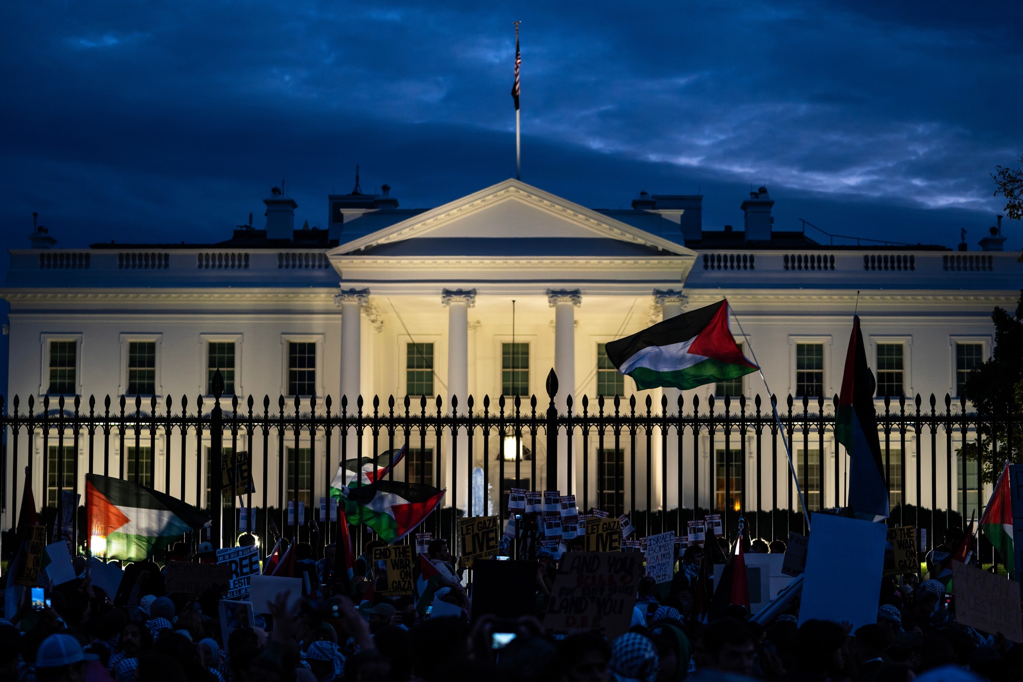 在11月4日,华盛顿白宫前举行亲巴勒斯坦示威的抗议者。摄影师:Nathan Howard/Bloomberg 彭博新闻社/Morning Consult进行了一项调查,调查了七个摇摆州的4922名注册选民:亚利桑那州800名注册选民,乔治亚州803名,密歇根州700名,内华达州437名,北卡罗来纳州702名,宾夕法尼亚州805名和威斯康星州675名。调查是在10月30日至11月7日期间在线进行的,跨越七个摇摆州的汇总数据根据性别、年龄、种族/族裔、婚姻状况、住房所有权、2020年总统选票和州进行了加权处理。州级数据根据性别、年龄、种族/族裔、婚姻状况、住房所有权和2020年总统选票进行了加权处理,以便近似于目标样本的注册选民在各自州内的比例。在七个州内,误差范围为正负1个百分点;在亚利桑那州、乔治亚州和宾夕法尼亚州为3个百分点;在密歇根州、北卡罗来纳州和威斯康星州为4个百分点;在内华达州为5个百分点。