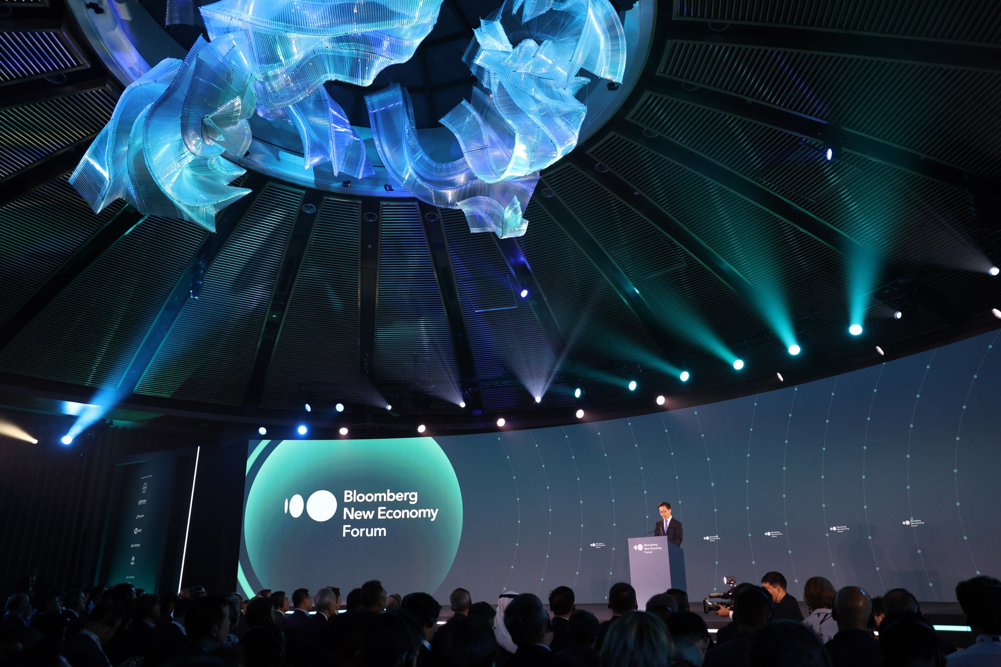 中国副主席韩正在新加坡的彭博新经济论坛上发言。
