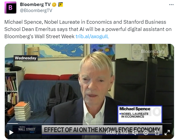 我们被告知,现在是所谓的生成式人工智能革命的早期阶段,但现在已经不算太早开始考虑它对我们经济的意义 — — 以及我们可能采取的措施以确保我们从中获得最大利益并避免最坏的情况。“我们看到一个世界,相对迅速地从需求约束转向供给约束模式,”诺贝尔奖得主迈克尔·斯宾斯说。“因此,我们正在寻找解决供给方面问题的方案,这些问题不仅给增长带来问题,还给通货膨胀的再现带来问题。”