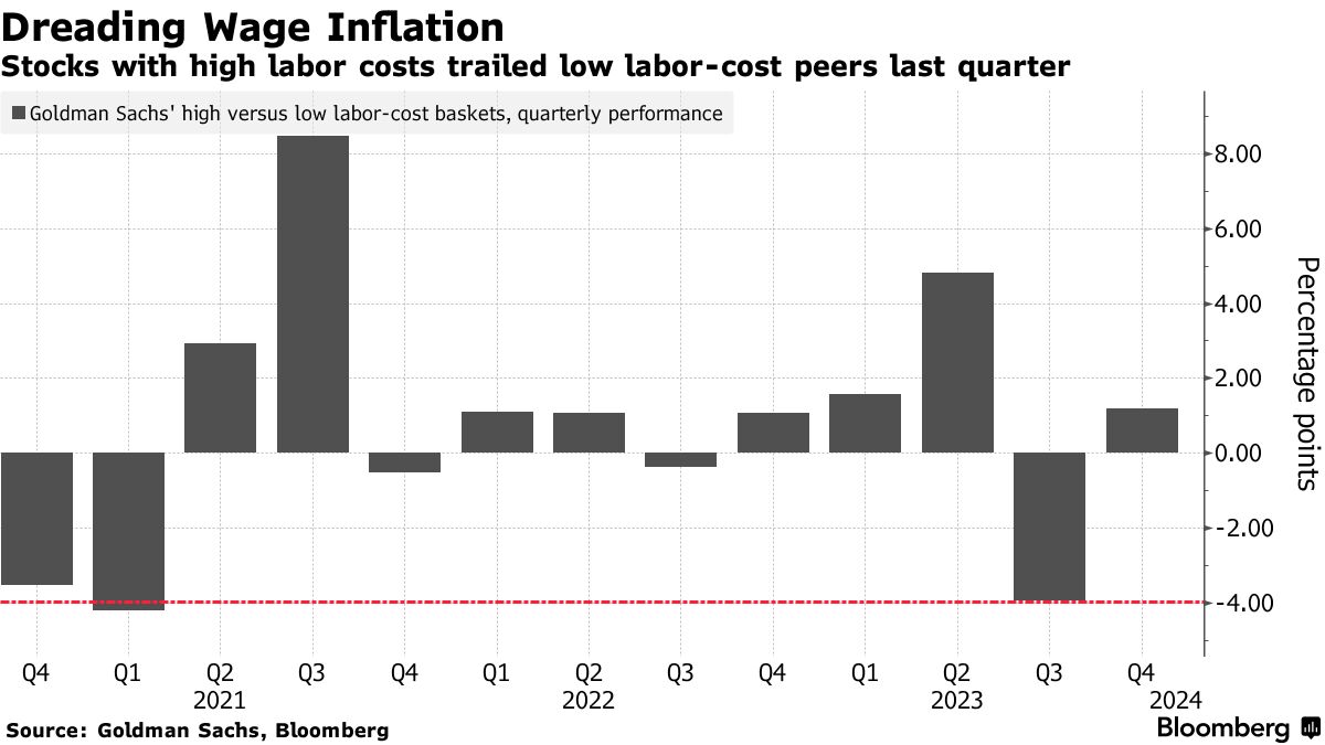 彭博的分析显示,围绕工资成本的情绪也在减弱,这种压力也反映在股价上。高盛集团编制的数据显示,上季度,标普500指数股票篮子中劳动力成本最高的股票(排除任何行业偏见)落后于成本较低的对应股票,跌幅为3.9个百分点,这是自2021年初以来的最大差距。