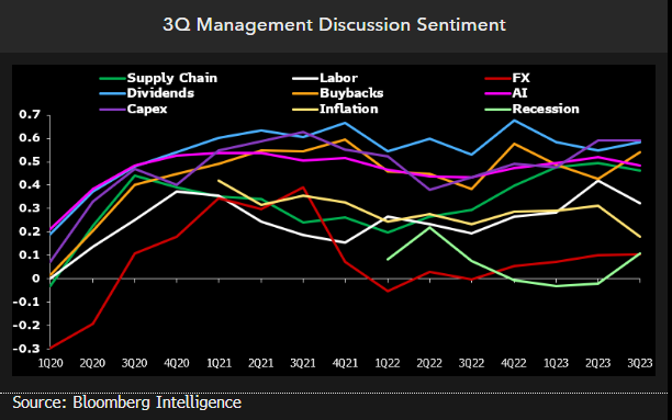 根据彭博情报研究本报告周期内收益电话会议记录的分析显示,企业管理人员对通胀的情绪已经恶化到2021年初才有的程度。对劳动力成本的焦虑也在加剧,这给华尔街分析师提供了更多的担忧基础。