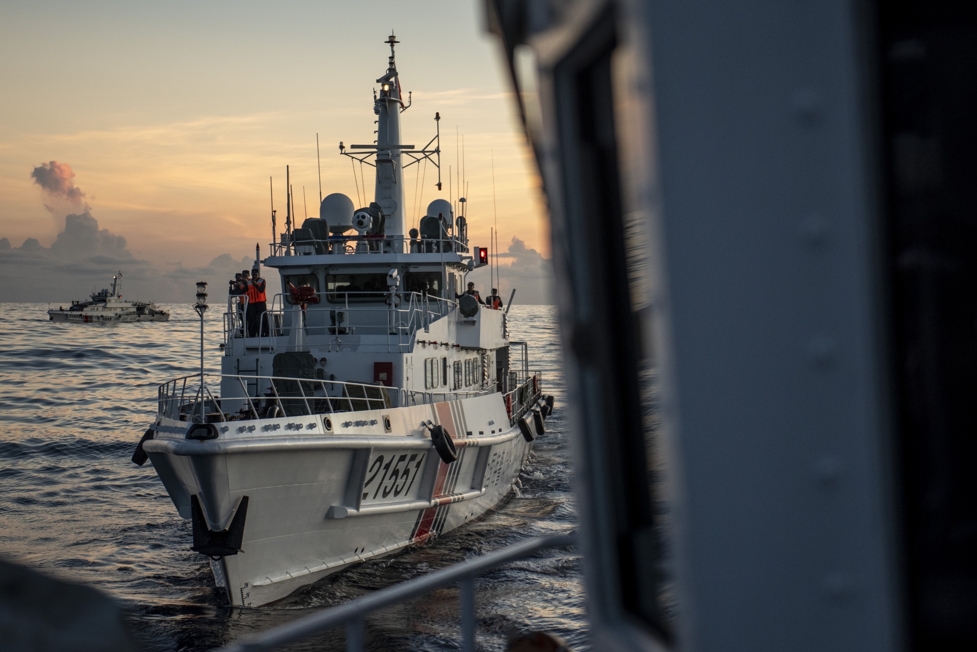 一艘包租船ML Kalayaan在为BRP Sierra Madre进行补给任务时,经过一艘中国海警船。摄影师:Lisa Marie David/Bloomberg作为海岸警卫队船只之一,BRP Sindangan靠近暗礁时,一艘来自中国海警的快艇靠近并突然横穿其航道。几分钟后,Sindangan被四艘中国船只挡住——其中两艘来自海警,另外两艘是渔船。